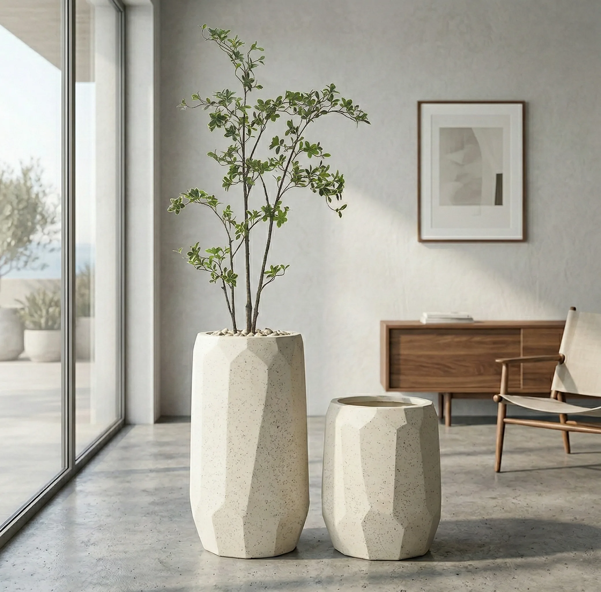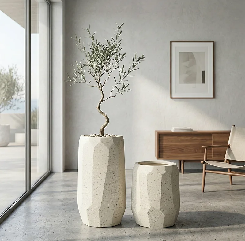 Minimalistický tvar s čistými líniami zvýrazňuje moderný dizajn, zatiaľ čo neutrálna piesková farba umožňuje jednoduché kombinovanie s rôznymi typmi rastlín – od zelených izbových rastlín až po okrasné trávy či menšie stromčeky. Nadčasový vzhľad sa výborne dopĺňa s materiálmi ako drevo, kov alebo betón.