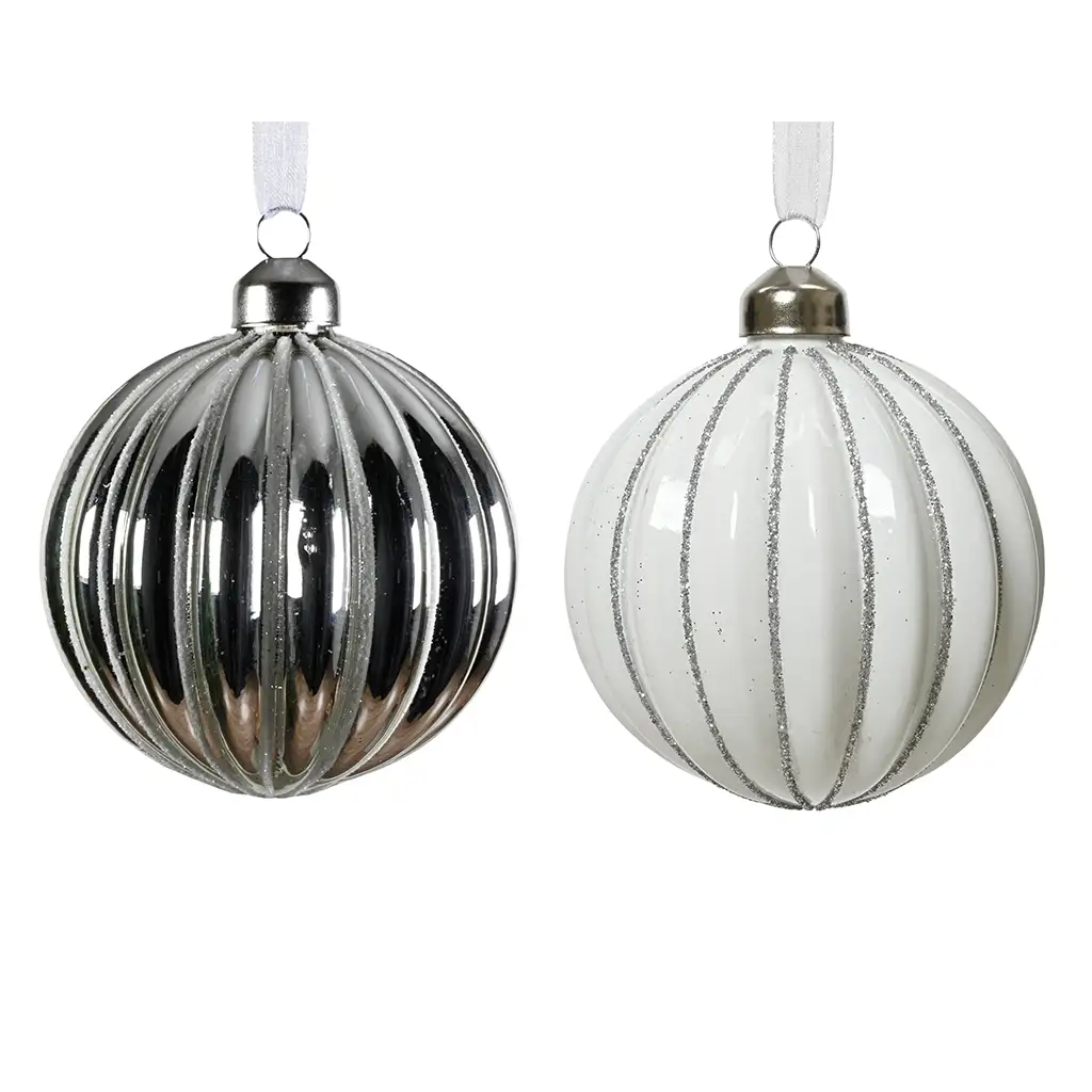 Táto sklenená ozdoba s priemerom 8 cm v strieborno-bielej farbe dodá vašim vianočným dekoráciám elegantný a moderný vzhľad. Vhodná na zavesenie na stromček.